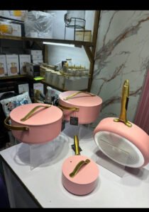 set features a soft pastel finish with elegant golden handles, blending beauty